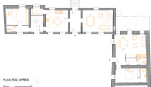 La réorganisation des espaces intérieurs nous a permis de répartir les usages de manière judicieuse. Ainsi, nous avons modifié l’accès en positionnant l’entrée au centre du plan et en organisant les espaces de vie de part et d’autre tout en reportant les espaces de service à l’extrémité du bâtiment